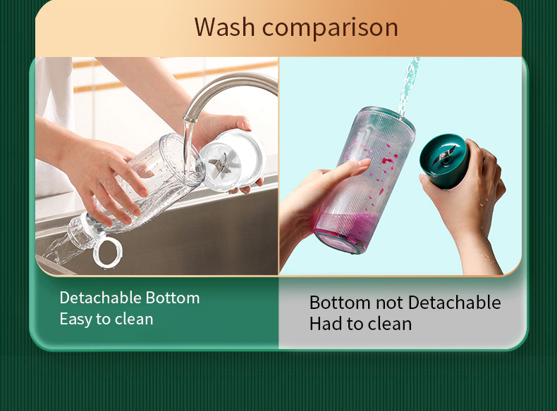 - The juicer cup can be opened up and down. Open the lid to drink, and open the bottom to clean.Double-tap the switch to turn on the power. While working, hold the bottle at 45 degrees and shake the bottle for better mixing.The cutter head of the blender is tightly waterproof and can be washed directly with water, easy to clean